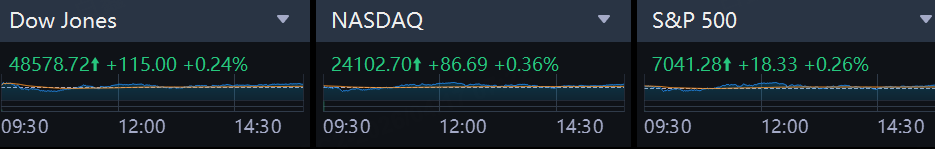 The U.S. major indexes closed as follows: Dow Jones up 0.24% at 48,578.72; S&P 500 up 0.26% at 7,041.28; NASDAQ up 0.36% at 24,102.70. A modest rebound across large-cap technology shares helped all three gauges finish higher, extending the prior session’s record-setting trend despite lingering geopolitical and policy uncertainties.