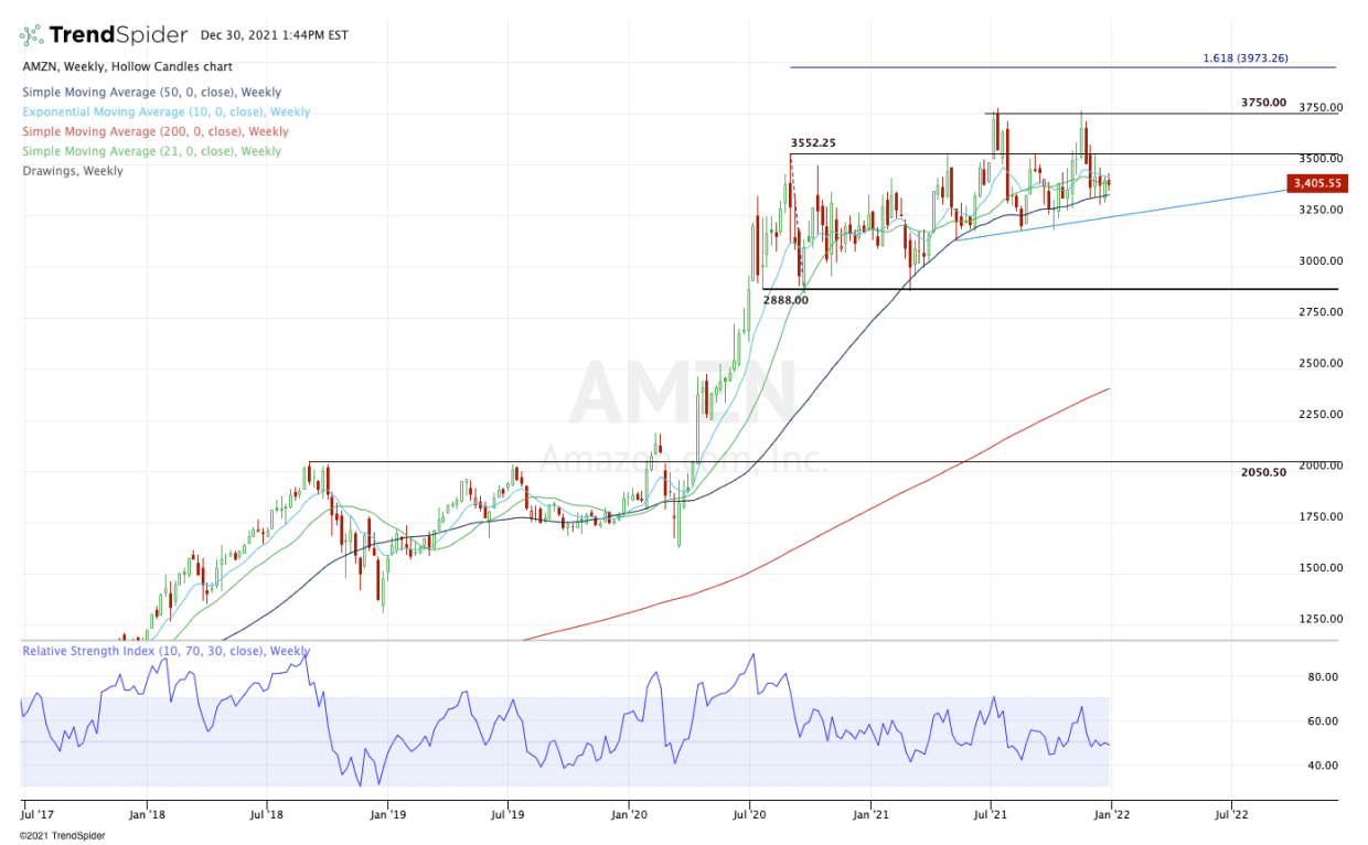 Amazon is up just 2.5% in 2021 with one trading day left to go. Here's how to trade the stock as we gear up for 2022.