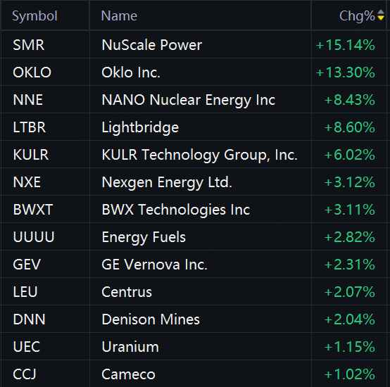 Nuclear energy stocks rallied in morning trading. NuScale Power rose 15%; Oklo rose 13%; Lightbridge rose 9%; NANO Nuclear Energy rose 8%; KULR Technology rose 6%; Nexgen Energy, BWX Technologies, and Energy Fuels rose 3%.