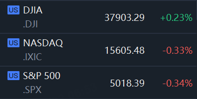 The Dow Jones Industrial Average rose 87.37 points, or 0.23%, to 37,903.29, the S&P 500 lost 17.3 points, or 0.34%, to 5,018.39 and the Nasdaq Composite dropped 52.34 points, or 0.33%, to 15,605.48.
