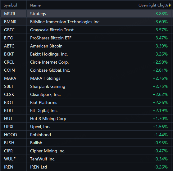 Strategy, BMNR up 4%; Coinbase, Circle, SBET, MARA up 3%.