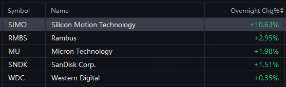 Silicon Motion up 11%; Rambus up 3%; Micron, SanDisk up 2%.