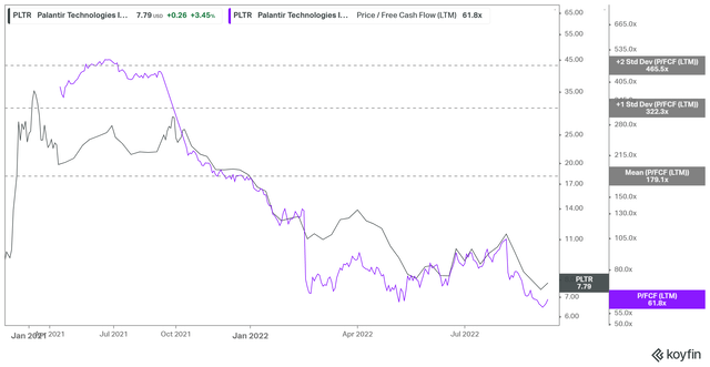 PLTR last traded at a TTM free cash flow (FCF) multiple of 61.8x, close to its lows in May. Even though it still traded at a discernible premium, given its growth profile, that level has been supported robustly. As a result, the battering from PLTR's August highs has improved its valuation remarkably, as it collapsed nearly 38% to its August lows. We surmise that a further fall is unlikely, as Palantir is projected to recover its FCF margins through FY24.