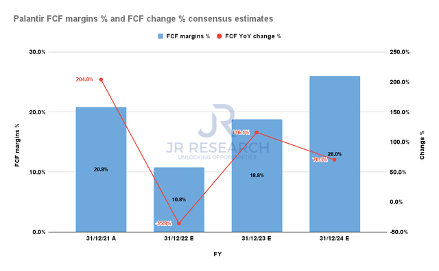 As a result of the market's and Street's pessimism, Palantir would have much easier comps to lap in FY23. Moreover, as seen above, Palantir's FCF growth is expected to bottom in FY22 before growing by 116% in FY23. Therefore, we are confident that these estimates suggest that Palantir's competitive moat has not been eroded but merely a momentary slowdown in deal closures.