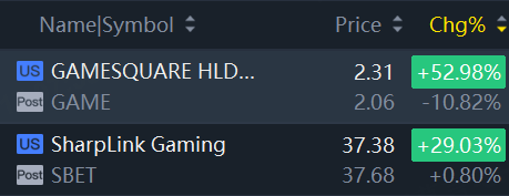 GameSquare stock rocketed 53%, SBET surged 29% as ethereum topped $3,400 at one time.
