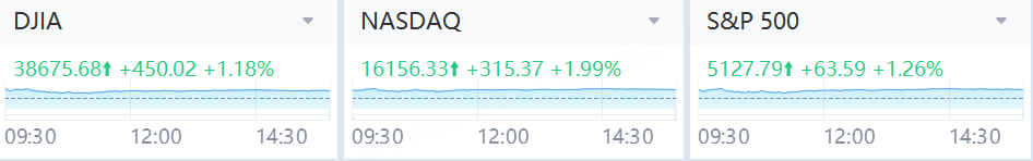 The Dow Jones Industrial Average rose 450.02 points, or 1.18%, to 38,675.68. The S&P 500 gained 63.59 points, or 1.26%, at 5,127.79 and the Nasdaq Composite added 315.37 points, or 1.99%, at 16,156.33.