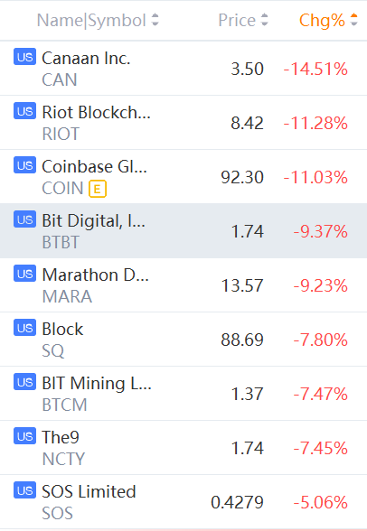 Coinbase, Block, Bit Digital, Riot Blockchain, BIT Mining, Marathon Digital, SOS Limited and The9 fell between 2% and 11%.Bitcoin is falling toward levels last seen in July 2021, part of a wider retreat in cryptocurrencies amid a global flight from riskier investments.