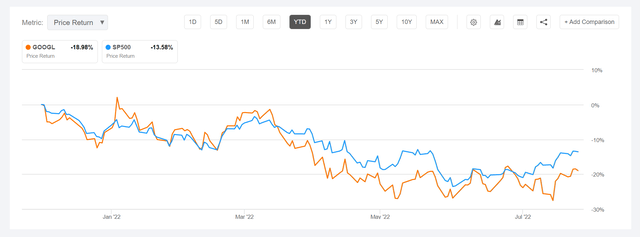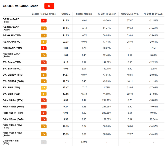 可以说,评估 Google 的最简单(但也是最肤浅和无效)的方法是通过简单的多重分析。根据Seeking Alpha编制的数据,谷歌目前的一年期远期市盈率为 22 倍,市盈率为 5.5 倍,市盈率为 5.3 倍。
