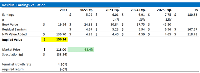 对于相对多重比较,我计算出 173 美元的目标价,对于部分总和估值,我认为 187 美元是公平的,对于剩余收益模型,投资者可以假设 156.24 美元的锚定价格。