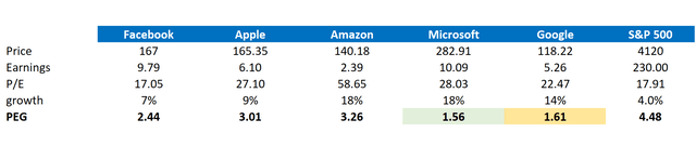 鉴于上述最初的多次介绍,投资者可能会争辩说谷歌价格昂贵,这将是故事的结局。然而,我认为这个故事还有很多。为了准确反映多重估值,必须考虑公司的增长。此外,由于投资是一门相对学科(在机会集中找到最佳选择),因此需要进行相对比较。