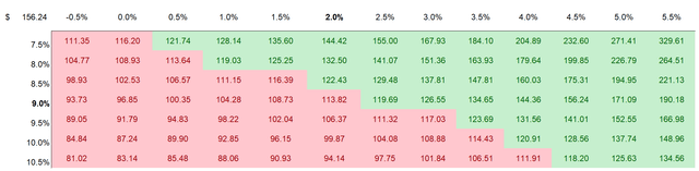 据我了解,对于谷歌的要求回报和终端业务增长,投资者可能会有不同的假设。因此,我还附上了一个敏感度表来测试不同的假设。作为参考,与当前市场价格相比,红色单元格意味着高估,绿色单元格意味着低估。