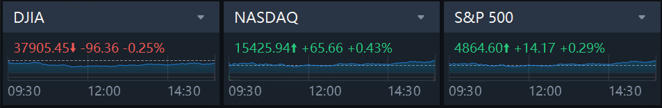 The S&P 500 climbed 0.29% to end the session at 4,864.59 points. The Nasdaq gained 0.43% to 15,425.94 points, while Dow Jones Industrial Average declined 0.25% to 37,905.45 points.