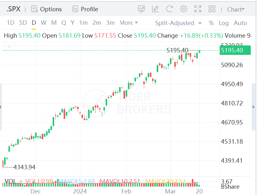The S&P 500 index jumps 0.33% and hits a record high after the Fed leaves interest rates unchanged for a fifth straight meeting, while its new "dot plot" shows policymakers maintain their forecast of three rate cuts by the end of 2024.