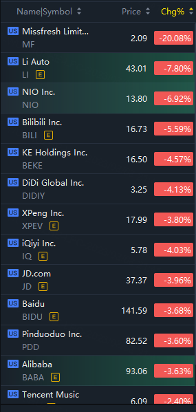 Hot Chinese ADRs turned down in morning trading; Missfresh Limited tumbled over 20% after surging 410% in 2 days.