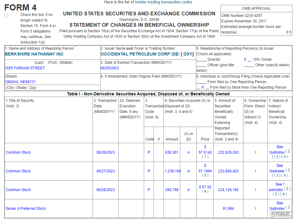 监管机构的一份文件显示,6月26日-28日期间,伯克希尔支付了约1.221亿美元购买了214万股西方石油股票,平均买入价格为每股约57.05美元。