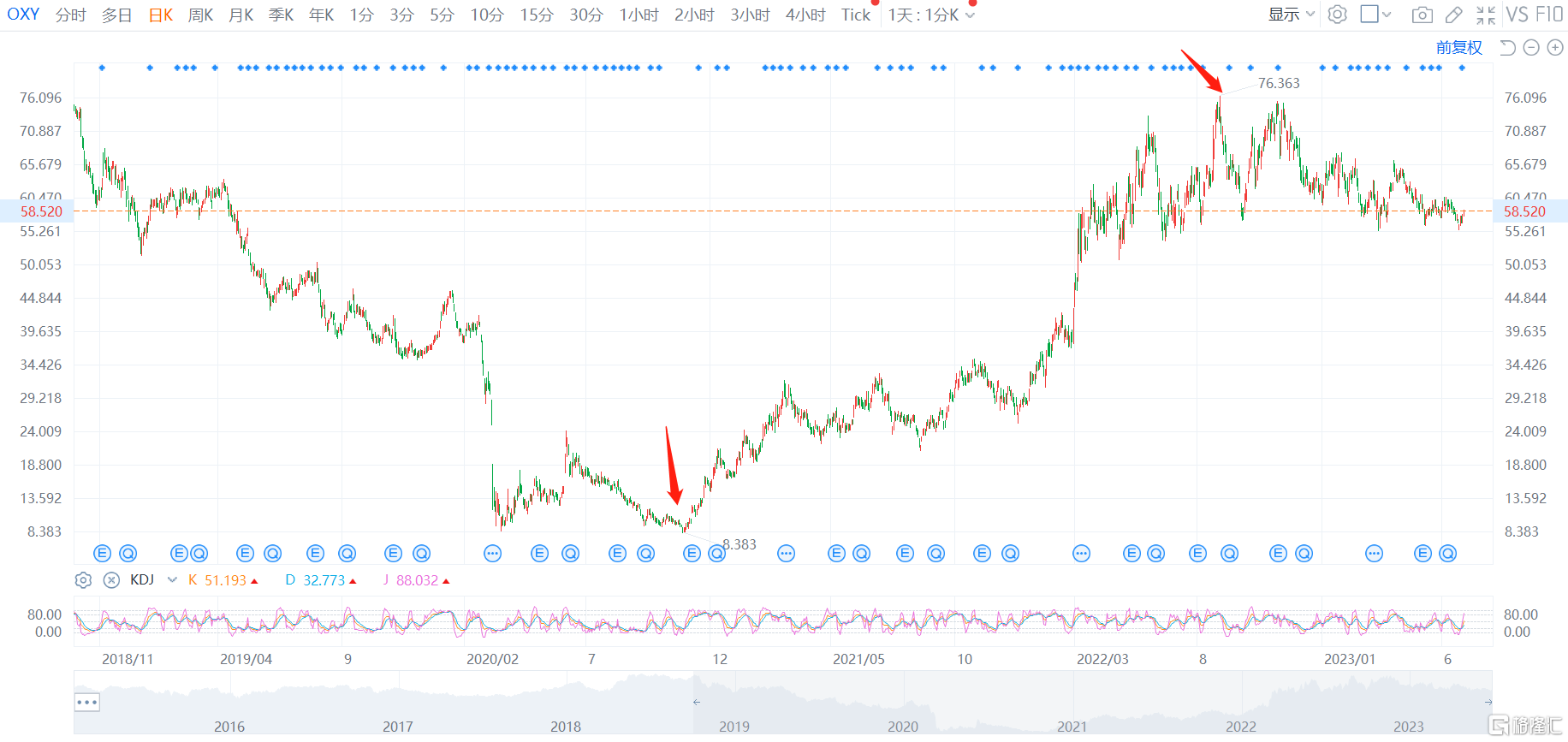 然而,2020年一季度,新冠爆发,原油价格暴跌,甚至出现负油价的情况,西方石油股价也跟随走低,一度跌至8.38美元/股。