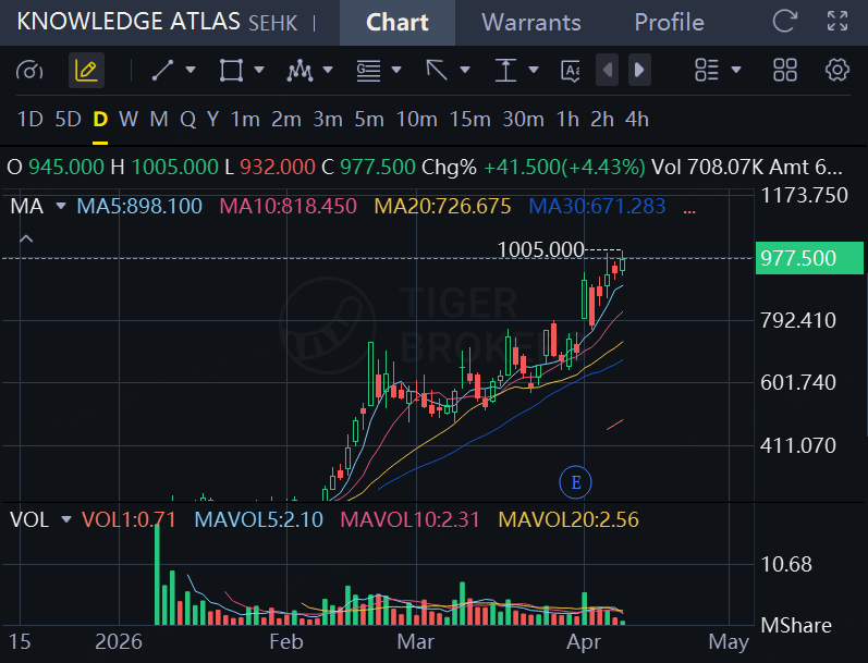 Knowledge Atlas Rises as Much as 7% Intraday, Briefly Breaks HK$1,000 Mark at HK$1,005 to Hit Record High, Now Up 4.5%