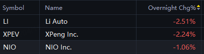 Chinese EV stocks fell in overnight trading. Li Auto down 3%; XPeng down 2%; Nio down 1%.
