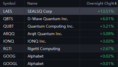SEALSQ up 14%; D-Wave Quantum up 6%; IONQ, Rigetti Computing, QUBT up 3%.