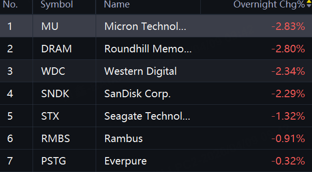 Storage Shares Fall. Micron and DRAM down 3%; Western Digital and SanDisk down 2%.