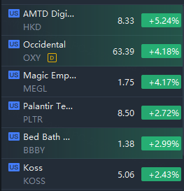 Meme stocks rebounded in morning trading; AMTD Digital Inc. gained over 5% while Occidental rose over 4%.