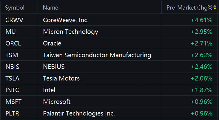 Market-favorite tech Stocks rallied in premarket trading. CoreWeave rose 5%; Micron, Oracle, TSMC, and Nebius rose 3%; Tesla and Intel rose 2%; Microsoft and Palantir rose about 1%.