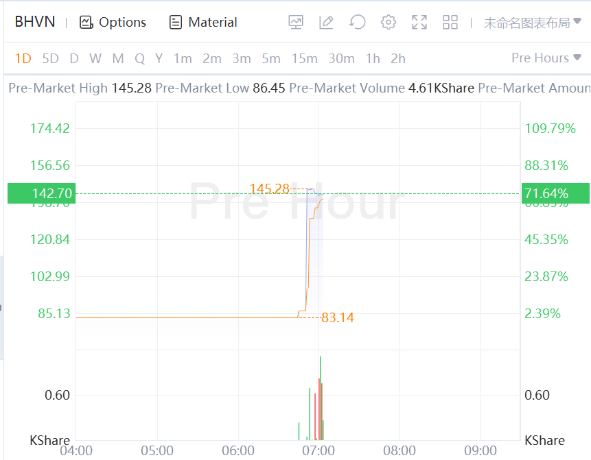 Biohaven shares immediately soared 71% premarket; the stock closed at $83.14 on Monday.