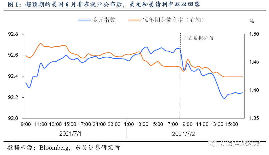 近期海外市场的走势有些令人困惑。尤其是美国6月非农就业数据公布后,尽管85万的新增就业创下10个月来的新高,但在这一超预期的数据发布后,10年期美债利率和美元指数双双走低,并没有兑现这一经济基本面的利好(图1)。往稍长一些的历史来看,美元指数确实在美联储6月议息后有所反弹,但10年期美债利率一直在低位震荡。那么,两者的表现究竟反映了怎样的市场预期?