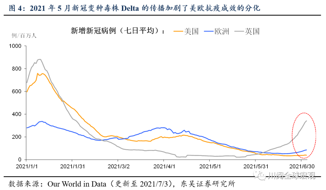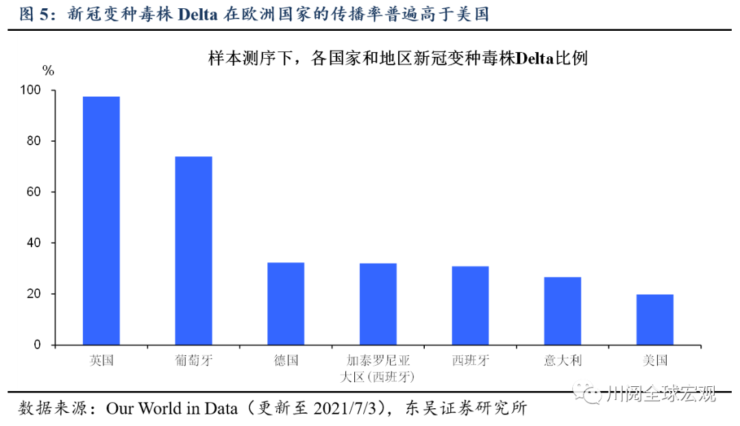 另外也是更重要的一点,即美欧经济分化有可能加剧。近期新冠变种毒株Delta的传播加剧了美欧抗疫成效的分化(图4)。欧洲至少接种一剂新冠疫苗的人口占比约为40%,而美国近55%,疫苗的保护下Delta在美国的传播率普遍低于欧洲国家(图5)。因此短期内欧洲经济的恢复势必比美国更易受Delta冲击,尤其是考虑到欧洲经济的重启力度本来就弱于美国。因此,在美欧经济分化加剧的背景下,避险资金回流美国也将给美债利率带来下行压力,比如6月中旬以来海外资金对于美债的净流入一直在增加。