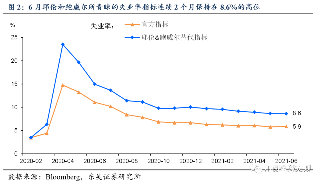 近期美元的反弹主要反映了美联储货币政策的转鹰,但为何超预期的6月非农就业没有助其进一步反弹?我们认为问题在于这一数据并不能让美联储确信taper或加息可以更快的到来。比如此前美联储副主席Clarida已经表示“3个月移动平均的新增就业在50万以上是公开讨论taper的必要条件”,6月非农就业虽然大增85万,但由于4月数据的低迷,3个月移动平均下来仅为55.8万,仅略高于50万的门槛。同时,失业数据并没有因就业增长而改善,耶伦和鲍威尔所青睐的失业率指标在6月依然保持在8.6%的高位没有下降(图2)。
