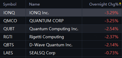 QMCO, IONQ, QUBT down 3%; Rigetti Computing, D-Wave Quantum down 2%.