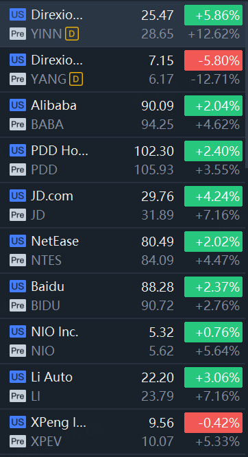 Chinese ADRs jumped in premarket trading. YINN rose 13%; Alibaba and XPeng rose 5%; NIO rose 6%; PDD Holdings rose 4%; JD.com and Li Auto rose 7%.