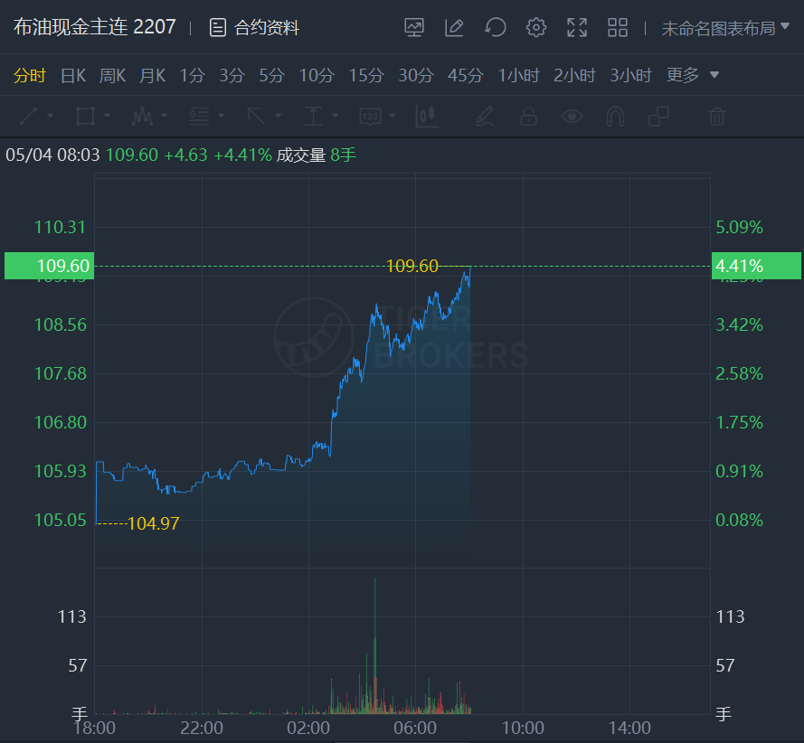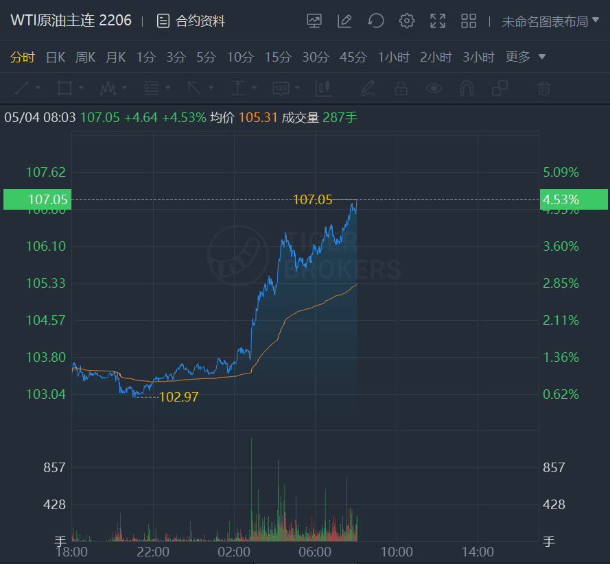 原油期货持续拉升,截止发稿,WTI原油涨4.53%,报107.05美元/桶;布伦特原油涨4.41%,报109.6美元/桶。
