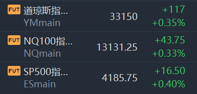 5月4日,美股三大股指期货小幅走高,截至发稿,道指期货涨0.35%;纳斯达克100指数期货涨0.33%;标普500指数期货涨0.4%。