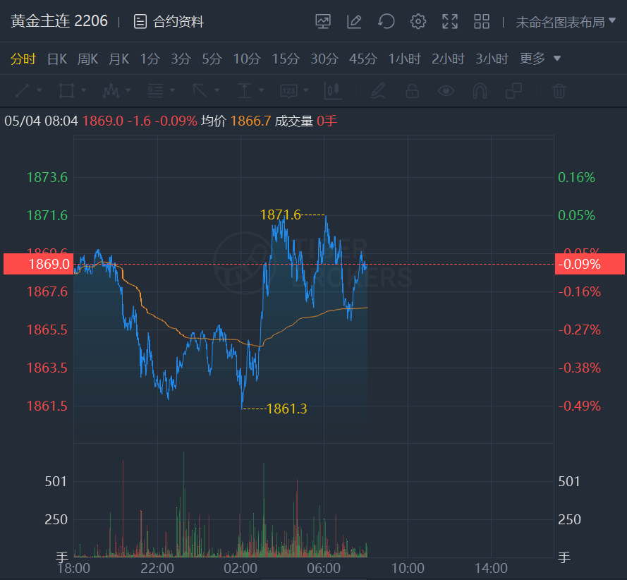 黄金期货微幅走低,截止发稿,跌0.09%,报1869美元/盎司。
