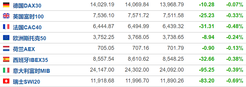 欧洲主要股指全线下跌,截至发稿,德国DAX30指数跌0.07%,英国富时100跌0.33%,法国CAC40跌0.48%。
