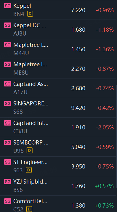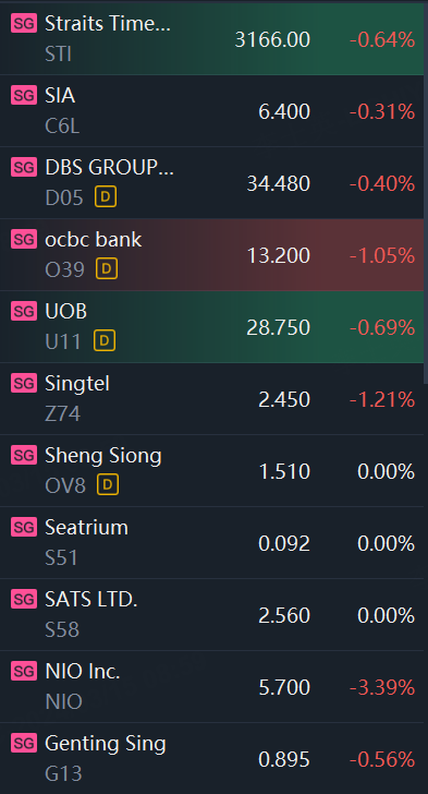 Singapore stocks opened lower on Friday. STI fell 0.6%, DBS fell 0.4%, OCBC fell 1.1%, UOB fell 0.7%, SingTel fell 1.2%, Nio fell 3.4%, Keppel fell 1%.