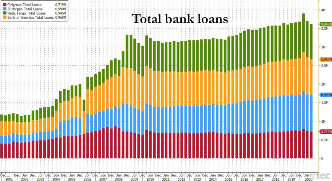 金融博客ZEROHEDGE根据各银行财报,得到以上四大银行贷款总额和和总存款的分解图: