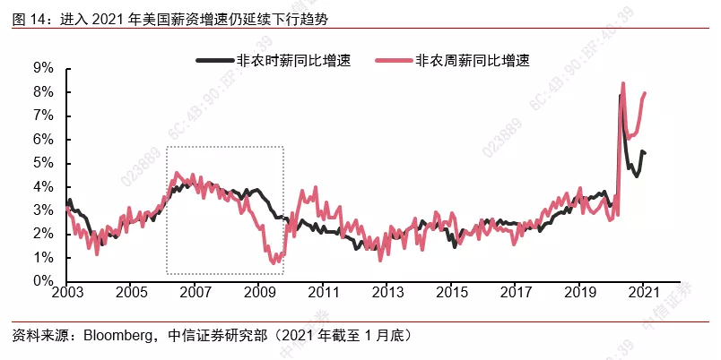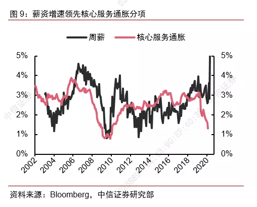 从目前的就业情况来看,美国整体就业缺口高达800多万,预计今年美国就业仍将缓慢恢复,这也意味着薪资增速将延续下行趋势。从2008年金融危机的经验来看,危机爆发后伴随着低收入人群的退出,薪资增速出现半年左右的短暂回升后便持续下行,直到2015年薪资增速才从低位开始回升。因此我们预计至少在2021年之前美国薪资增速都将延续下行趋势,从而对核心服务通胀水平形成拖累。