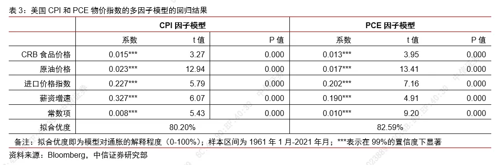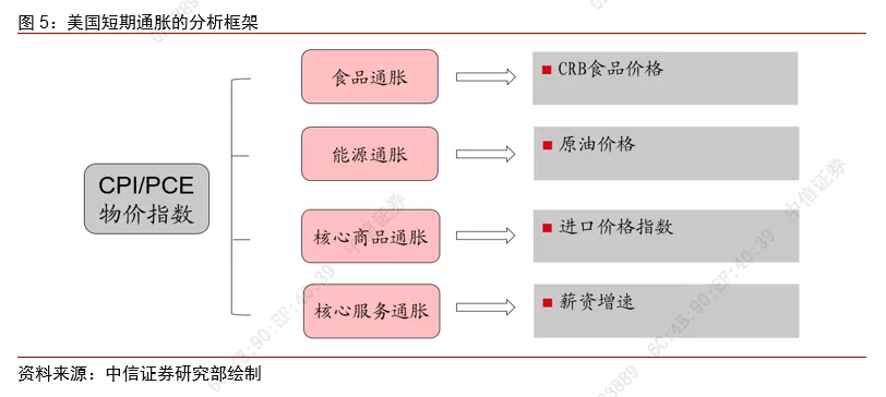 CPI和PCE物价指数均可以拆分为四大分项,分别是食品、能源、核心商品和核心服务。通过历史对比和统计方法筛选可以发现,这四大因素分别对应的领先指标分别是CRB食品、原油价格、剔除能源的进口价格指数、薪资增速。