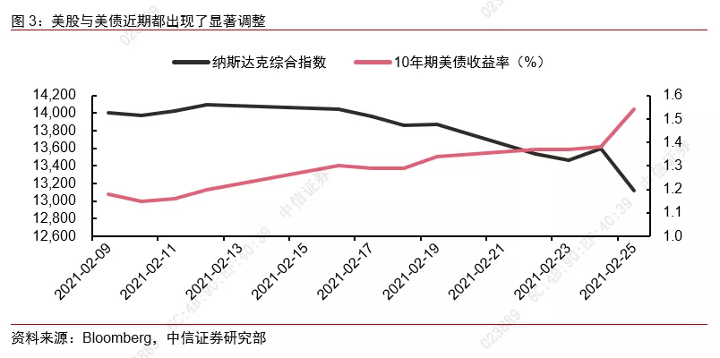 近期海外市场的表现也进一步反映了这一预期。自2月9日以来,短短两周10年期美债收益率上行36bp,最新10年期美债收益率已经向上突破1.5%,调整幅度十分明显。美股中对利率相对敏感的纳斯达克综合指数近期也出现了快速调整,近半月累计跌幅达6%。与此同时,自2月9日以来,美债实际利率触底上行,累计上行幅度超40bp,与美股美债的调整时点基本吻合。我们认为这背后主要反映了市场对于美联储货币政策收紧的担忧有所升温,带动实际利率上行,从而促成了美债短时间内的快速上行和美股高估值板块的剧烈调整。