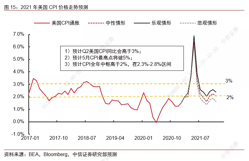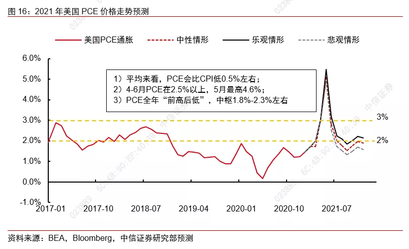 乐观情形下(2021年布油价格中枢为65美元/桶,薪资增速企稳回升至高于疫前水平),对应的美国全年CPI和PCE物价指数同比增速中枢分别为2.8%和2.3%;
