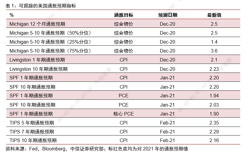 我们跟踪的美国通胀预期指标显示:以美国CPI为跟踪目标的1年期通胀预期均已超过2%,其中Michigan 12个月通胀预期已经达到2.5%;以PCE为跟踪目标的通胀预期也已超过1.9%,SPF1年期通胀预期为1.94%,核心通胀预期为1.9%。从历史时间序列来看,SPF和TIPS反映出来的通胀预期近期都出现了明显上行,且均高于疫情前的水平;对于通胀更加敏感的TIPS Breakevens(盈亏平衡通胀率)5年期通胀预期已经达到2.35%,创2014年(美联储结束QE)以来的新高。综合各项指标(取均值),当前市场对于2021年美国的通胀预期已经达到了2.13%,显著高于美联储2%的平均通胀目标,因此也引发了市场对于美联储货币政策收紧的担忧。