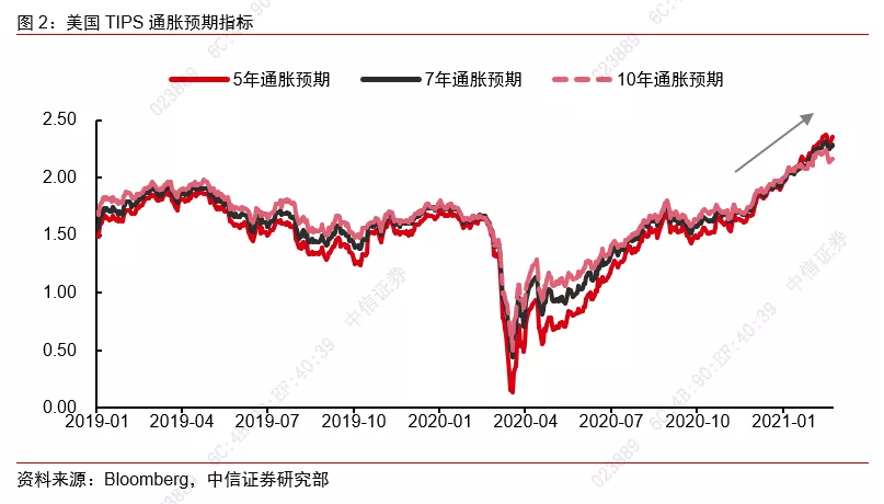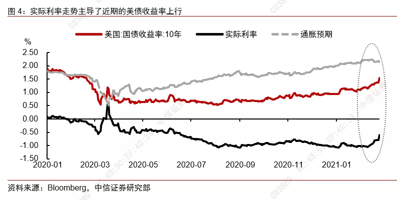 近期美国的通胀预期有所上升,我们跟踪的通胀预期指标反映出来的美国通胀预期已经超过2%。从美债实际利率的走势来看,市场对于美联储货币政策转向的担忧有所升温,从而导致了美债收益率的上行和市场高估值板块的调整。