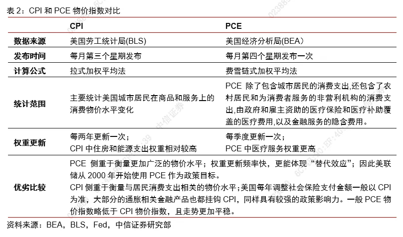 CPI和PCE都是衡量美国通胀的重要指标。PCE侧重于衡量更加广泛的物价水平;权重更新频率快,更能体现“替代效应”;因此美联储从2000年开始使用PCE作为政策目标。而CPI侧重于衡量与居民消费支出相关的物价水平;美国每年调整社会保险支付金额一般以CPI为准,大部分的通胀相关金融产品也都挂钩CPI,同样具有较强的政策影响力。两者各有兼顾,对于实际通胀水平的衡量也各有优势。因此本篇报告我们同时以CPI和PCE物价指数作为分析对象,以更好地评估实际通胀水平的趋势。
