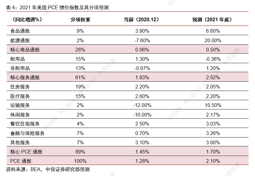 此外,我们也对核心通胀及其分项进行了预测。从各项权重来看,除了食品能源以外,核心通胀主要由核心商品(28%)和核心服务(60%)通胀组成。在中性假设下,我们认为今年美国的核心通胀不会有明显的上升,预计2021年年底在1.7%左右。