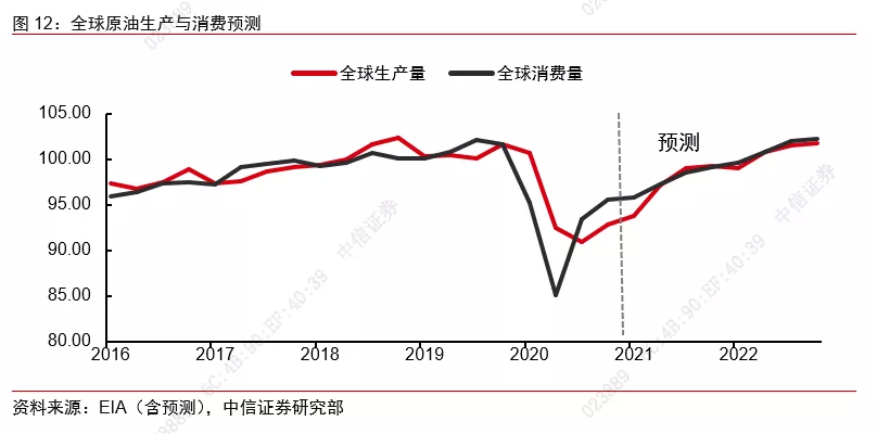 但全年来看,随着需求和原油价格的预期好转,供应端的压力也会逐渐增加。根据EIA的预测,原油供需基本面有望在今年下半年回归均衡状态,因此原油价格中枢难以继续大幅抬升。同时当前的布油价格已经在美国页岩油的短期盈亏平衡线(45-55美元)以上,页岩油如果增产则会对油价造成较大冲击。因此我们对全年的油价中枢依然维持谨慎乐观的态度。基准情形下,我们预计短期布伦特油价可能冲高至65美元/桶以上,下半年可能会有所回落,全年布油中枢可能在60美元/桶左右。