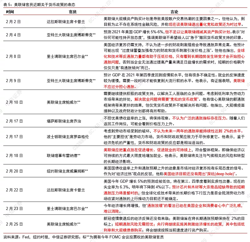 美联储全年大概率维持宽松的政策取向。短期通胀预期的上升更多源于疫情改善和疫苗接种加快带来的经济复苏预期,结合美联储近期官员的表态,我们认为宽松货币取向并未发生任何变化。往后看,虽然预计美国通胀在今年Q2将显著高于2%,但通胀的回升更多受到基数效应和供需错配的影响,目前尚不具备持续大幅抬升的基础,同时美联储对于通胀的容忍度也明显提升,预计暂时性的通胀冲高不会影响到美联储宽松的货币政策取向。