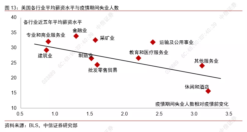 美国薪资增速延续下行趋势。疫情以来美国劳动力的薪资增速出现了明显的上行,主要原因在于低收入的劳动力退出了就业市场。从疫情期间各行业的失业情况来看,平均薪资水平越低的行业,疫情期间失业人数相对于其疫情前的比例越高。而近期薪资增速有所回落,也一定程度反映了低收入行业(休闲酒店、批发零售、其他服务业等)就业的改善。