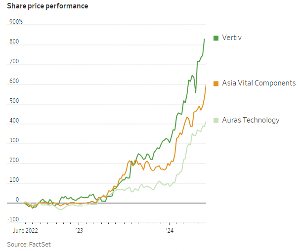 Like those of U.S.-based Vertiv, shares of Asian manufacturers for components used in cooling systems have soared too. Shares of Taiwan’s Asia Vital Components, have risen 600% since the end of 2022 while Auras Technology, also based in Taiwan, has gained 510%. Both companies are ramping up their production capacity to meet rising demand. Vertiv acquired CoolTera in December to boost its liquid cooling technology.
